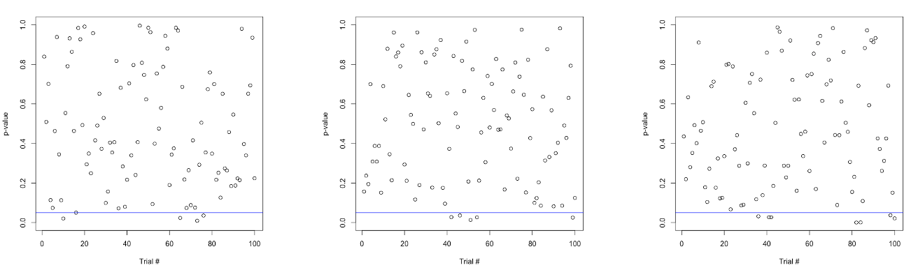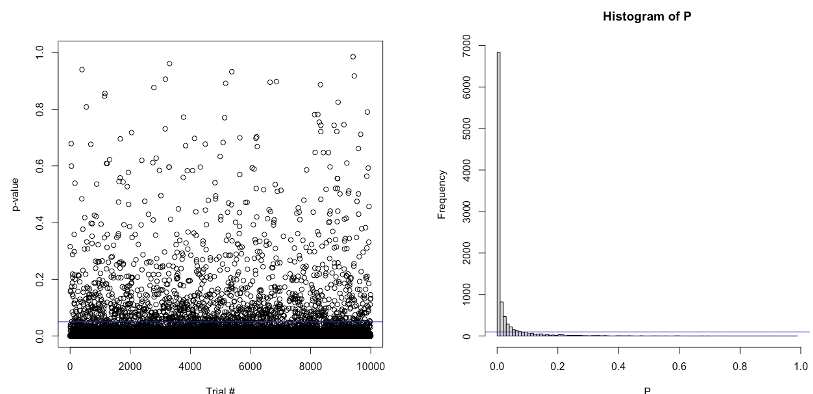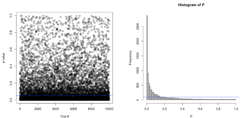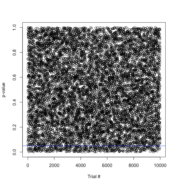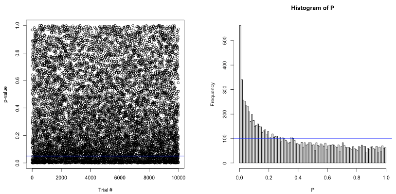 Effectivement, c’est un peu compliqué pour le lecteur non averti de se faire une idée de la distribution de la « fameuse » valeur de p, et de la façon que celle-ci a de danser plus ou moins frénétiquement en fonction de la présence ou non d’un effet. Lors d’une discussion avec des étudiants de Master autour de l’article de Simmons et collaborateurs (2011), j’ai essayé de leur en faire la démonstration avec une simple simulation sur R. Nous discutions de la pratique (questionnable) qui consiste a augmenter la taille de l’échantillon jusqu’à l’obtention d’un effet significatif, l’optional stopping. Je voulais leur faire comprendre qu’en l’absence d’un effet, la valeur de p se distribue de manière uniforme et qu’il est aussi probable d’obtenir un p d’une valeur comprise entre .01 et .02 qu’un p d’une valeur comprise entre .98 et .99. Par conséquent, s’arrêter de collecter des données aussitôt que p passe sous le seuil fatidique de .05 est risqué.