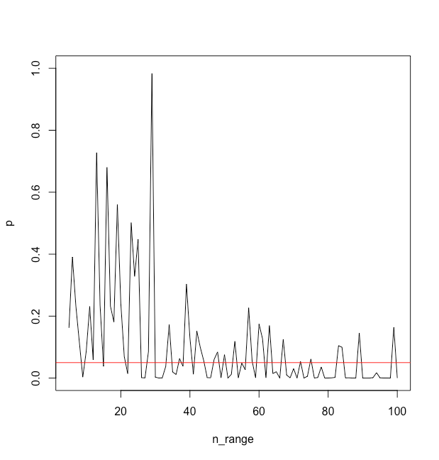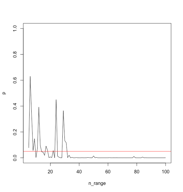 Pour ce premier essai, on voit que la valeur de p passe sous le seuil de .05 quand n=21, pour remonter autour de .80 quand n=22, puis redescendre en dessous de .05 à n=26, etc.