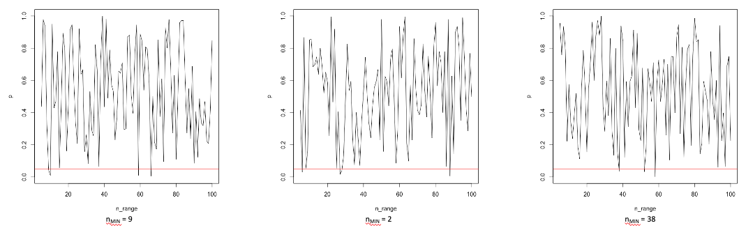 On peut retenter l’expérience plusieurs fois, en ne modifiant aucun paramètre de celle-ci, et voir qu’à chaque fois l’échantillon nécessaire (nMIN) pour obtenir un p < .05 change.