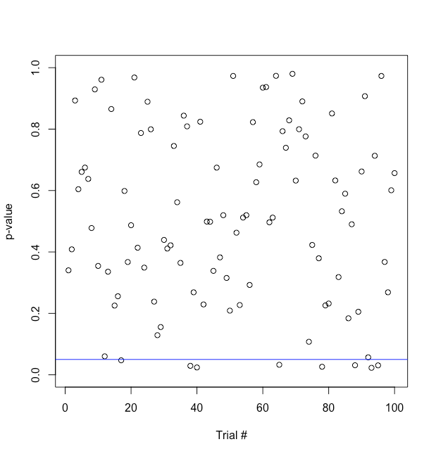 plot(trial,P, xlab="Trial #", ylab="p-value", ylim = c(0,1))