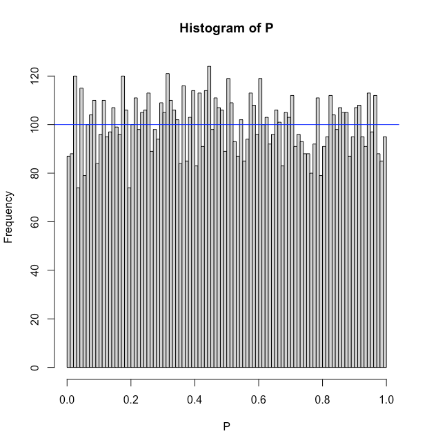 On voit bien avec ces simulations ce que veut dire que, en l’absence d’effet, la distribution de la p-value est uniforme. Une autre représentation consiste à faire un histogramme de la fréquence de la distribution de la valeur de p.